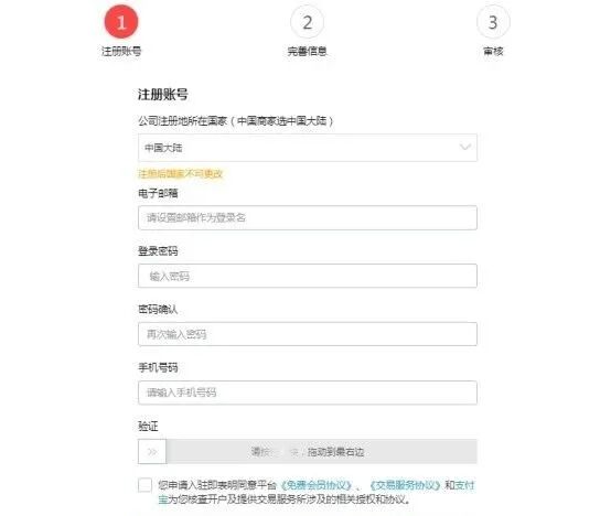第二步:填写公司注册所在地国家,电子邮箱,手机号及验证码