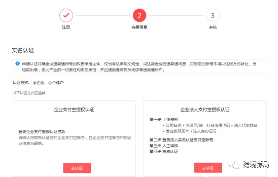 第三步:企业支付宝授权认证,或者企业法人支付宝授权认证,二选一即可,个体工商户企业支付宝号亦可入驻