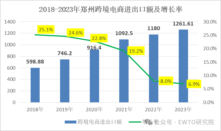 自2016年郑州综试区批复以来,郑州跨境电商交易额累计超6000亿元,年均增长20%以上(见下表)。2023年,全市跨境电商交易额1261亿元,同比增长6.9%。2024年上半年,郑州航空港区完成跨境电商进出口货值120.24亿元,同比增长54.83%;河南保税物流中心园区完成跨境电商B2C进出口交易额100.45亿元,同比增长58.09%。